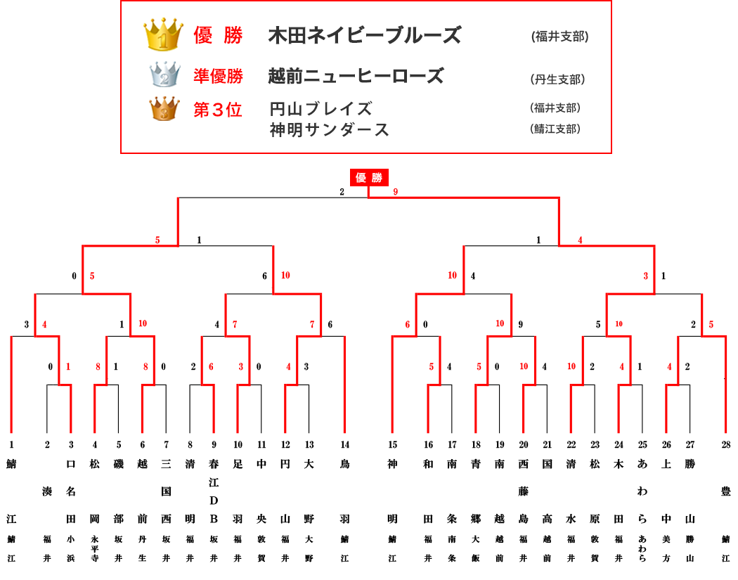 今大会では、福井県内各地から予選を勝ち上がった全28チームの選手達によって元気溢れる素晴らしい熱戦が繰り広げられました。